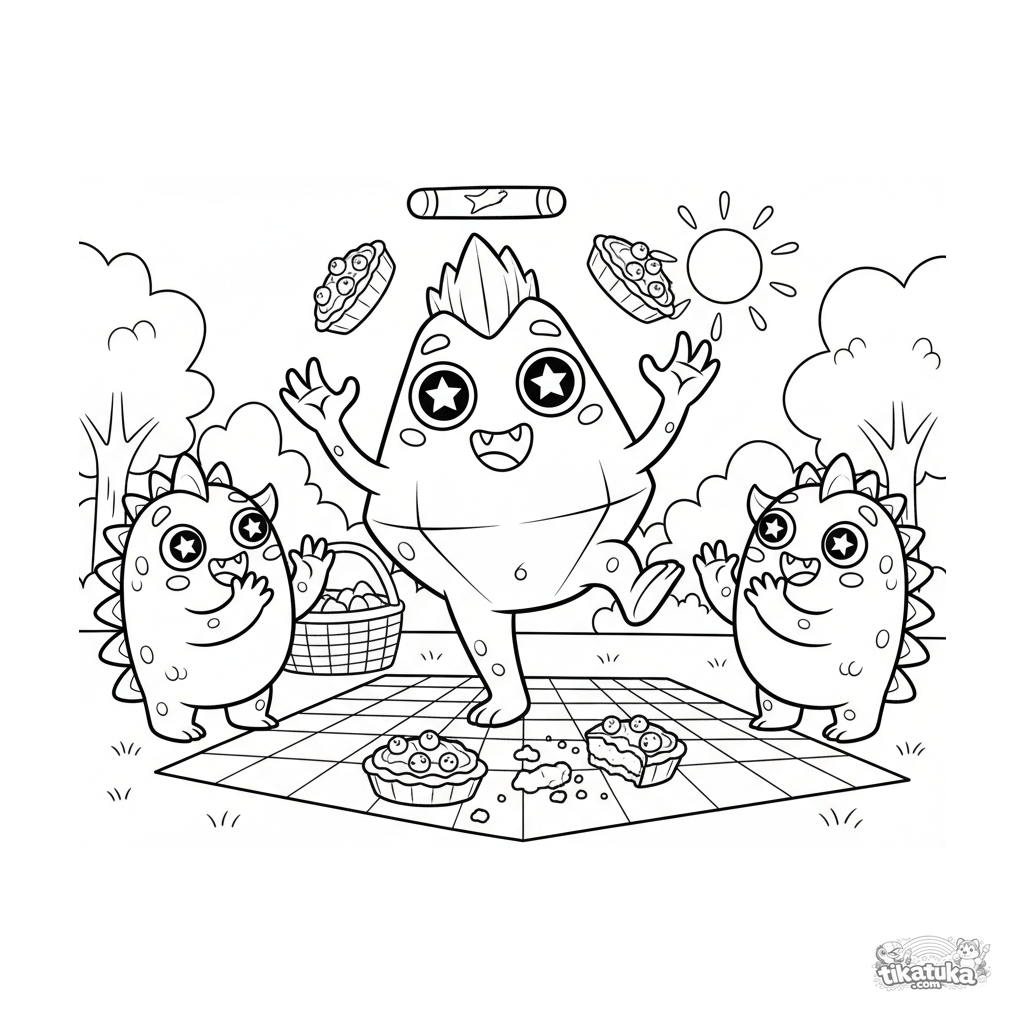 Página para colorear para 7-9 años: un monstruo espinoso con mohawk alegremente hace malabarismos con tartaletas en un picnic, otros monstruos observan. Escena dinámica.