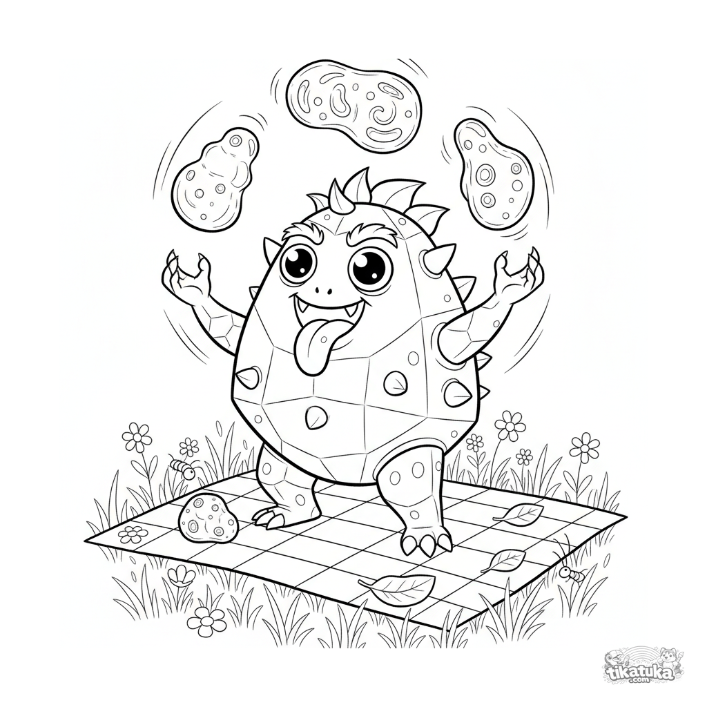 Página para colorear detallada para 10-12 años: un monstruo espinoso en movimiento hace malabarismos con frutas de goma gigantes en un picnic. Escena dinámica.