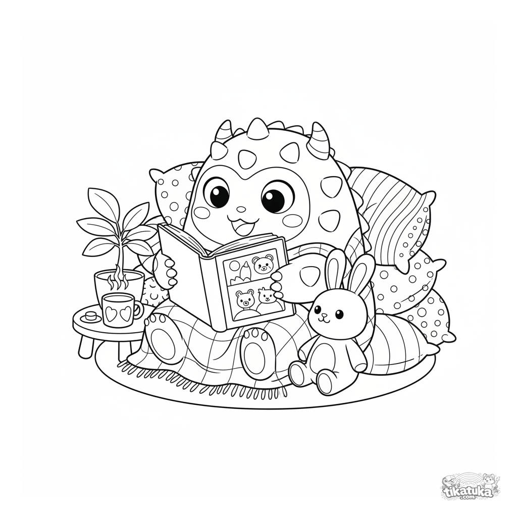 Página para colorear para niños: un monstruo espinoso pero lindo con ojos grandes lee un libro de imágenes a un conejo de peluche en un rincón acogedor. Escena cálida.