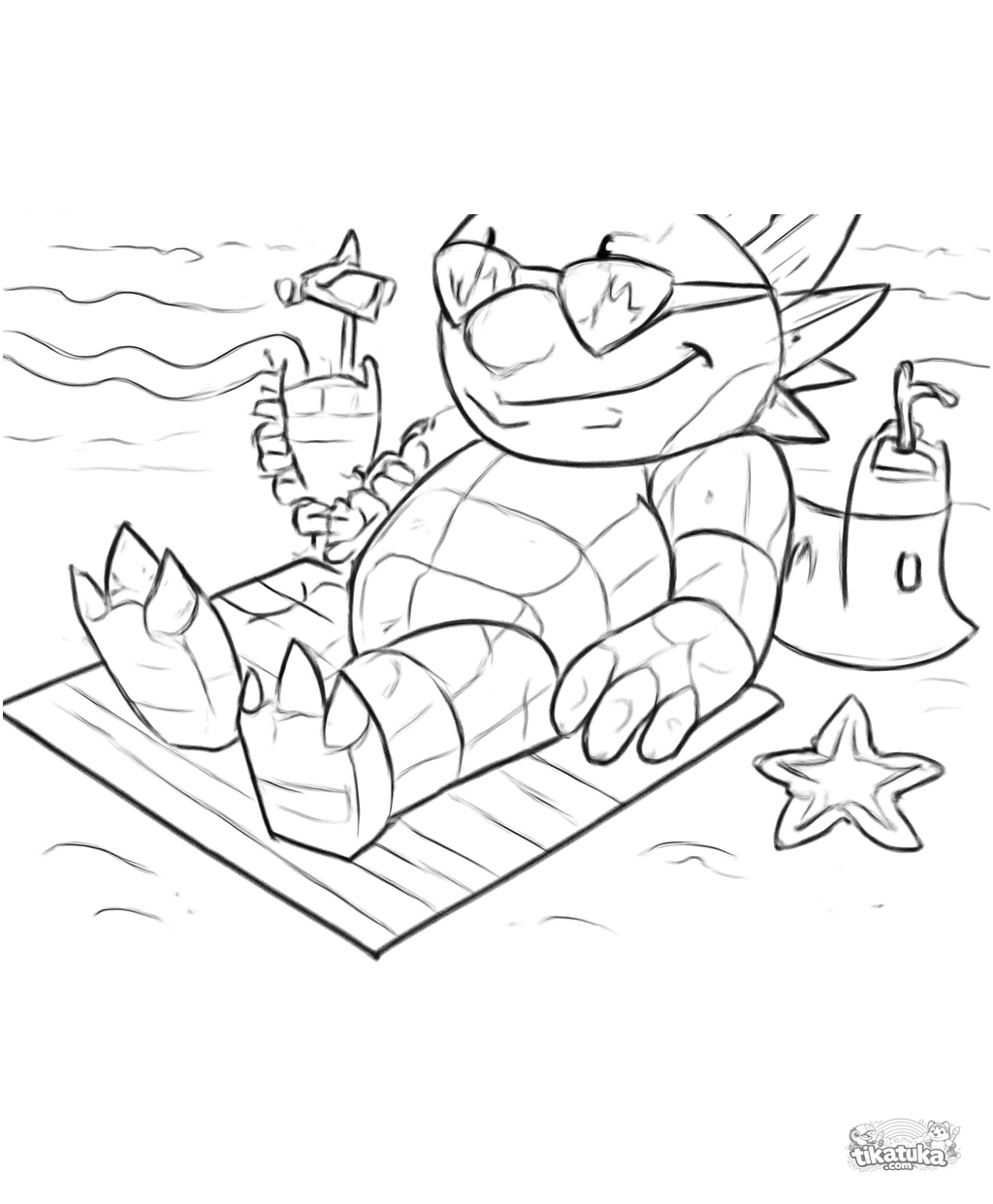 Página difícil para colorear de un monstruo de roca espinoso tomando el sol en la playa. Para niños de 8 a 12 años.