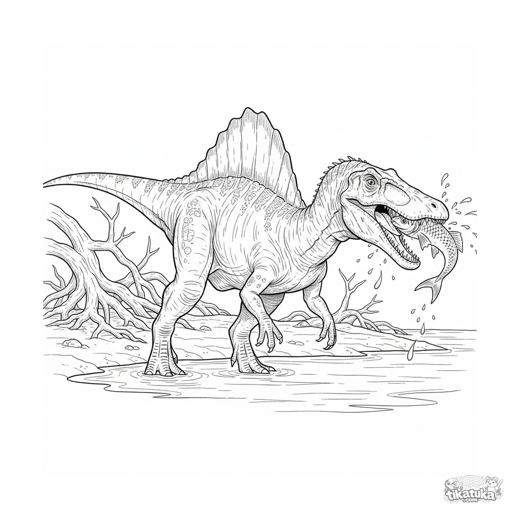 Página para colorear para 10-12 años: un spinosaurus atrapando un pez en una laguna tranquila de una playa antigua. Ilustración detallada estilo grabado vintage.