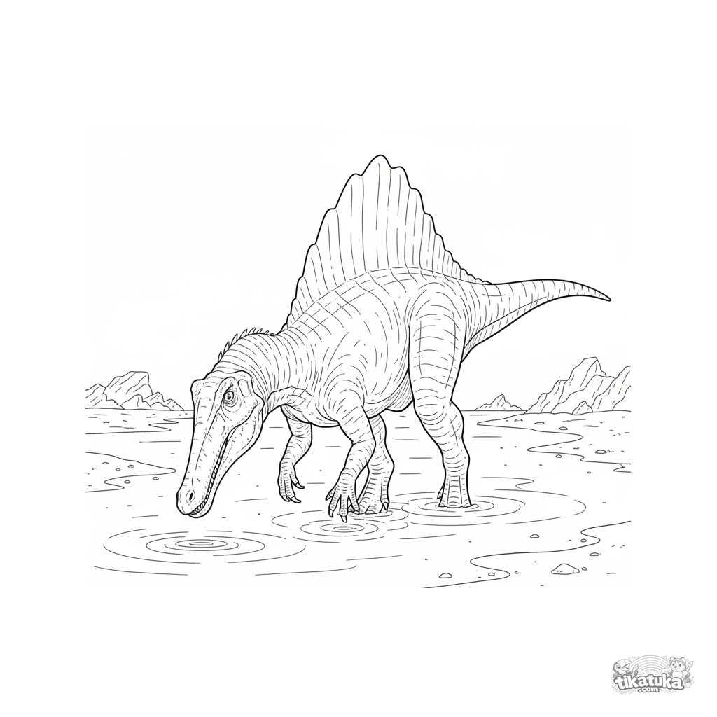 Página para colorear realista compleja para 10-12 años: un spinosaurus caza peces en una laguna poco profunda de un océano antiguo. Anatomía detallada y paisaje natural.