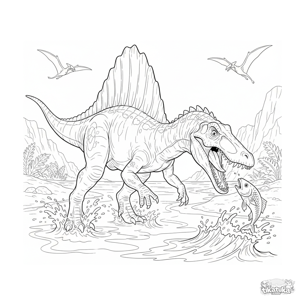 Página para colorear para niños mayores de 10-12 años: un espinosaurio pesca en las aguas poco profundas de una playa arenosa oceánica antigua. Alto nivel de detalle, formas anatómicamente precisas.