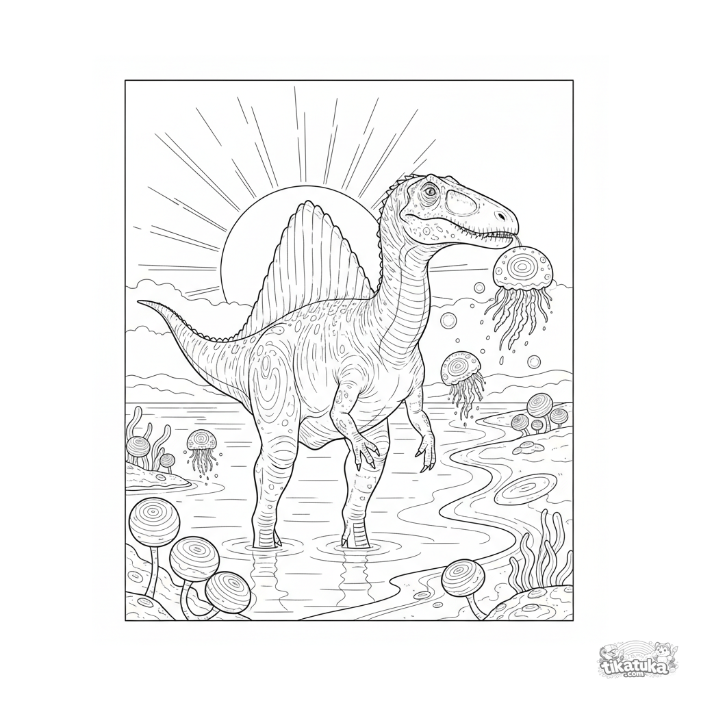 Página para colorear compleja para 10-12 años: un espinosaurio vadea en el crepúsculo, atrapando medusas brillantes en las aguas de un océano antiguo. Anatomía detallada y escena atmosférica.