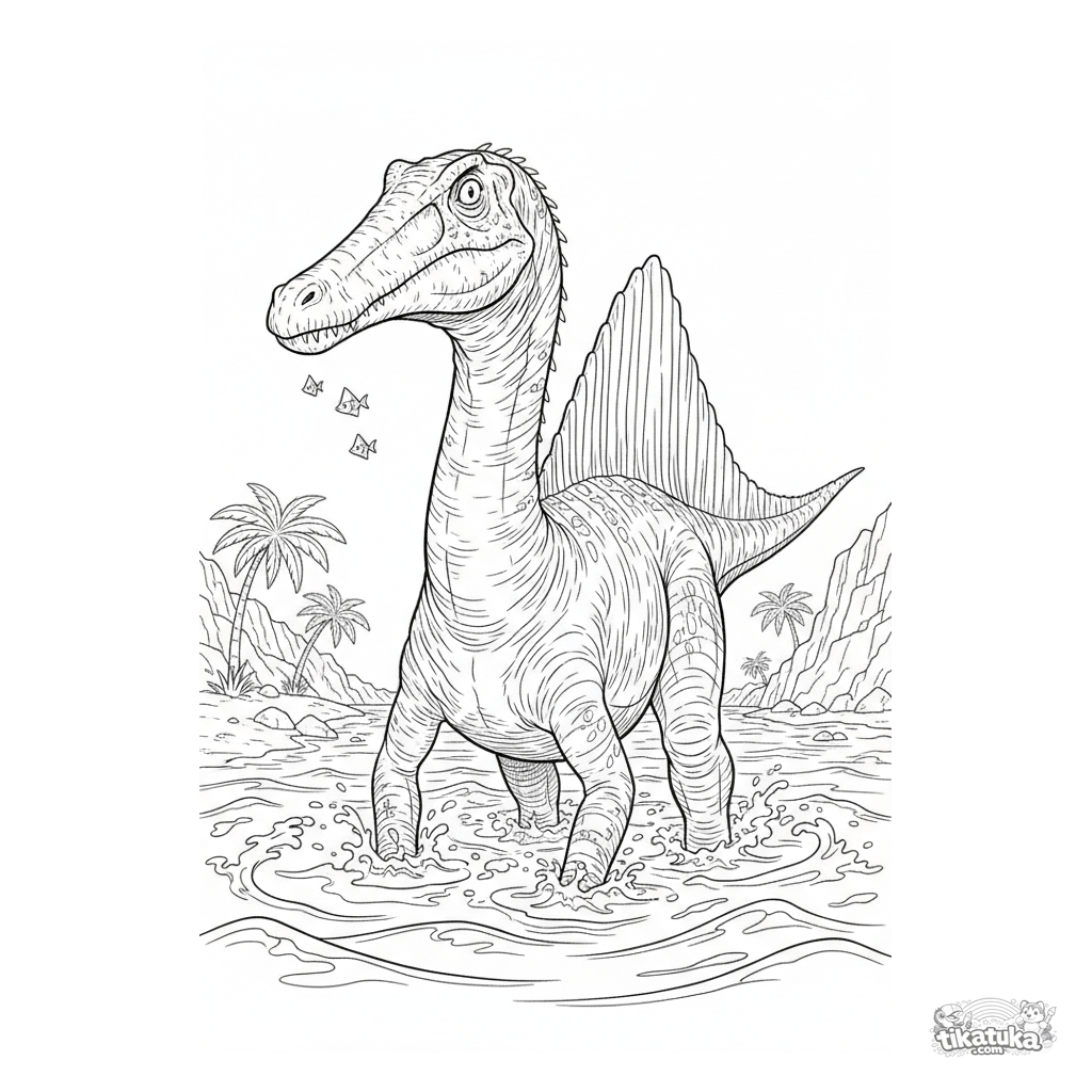 Página para colorear compleja para 10-12 años: un espinosaurio vadea el oleaje de un océano antiguo para cazar peces. Representación realista detallada con olas.