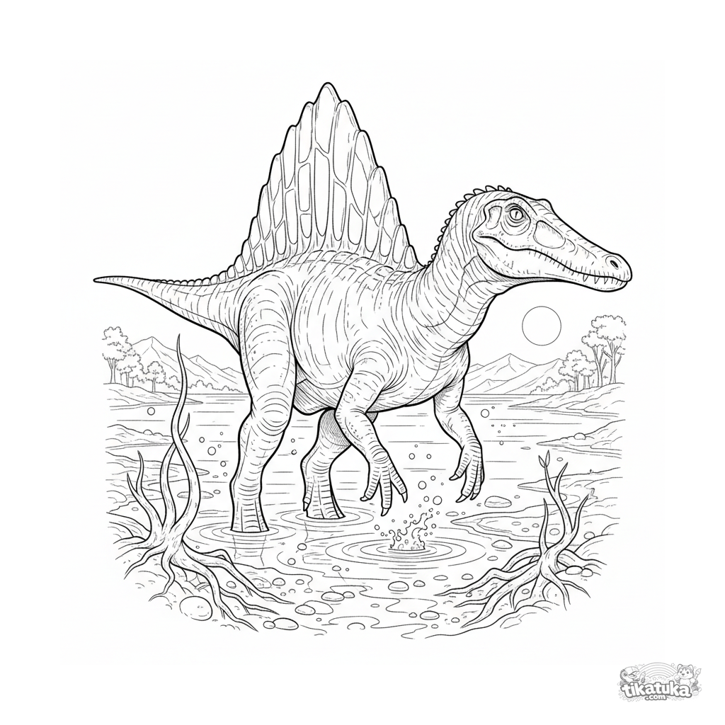 Página compleja estilo vintage para colorear para niños de 10-12 años: un espinosaurio vadea con cuidado por el agua de una laguna costera. Estilo de grabado detallado.