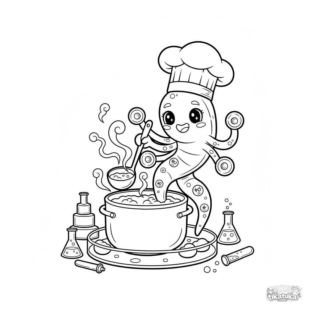 Página para colorear para niños: una divertida bacteria espiral chef cocina sopa en una placa de Petri. Colorea el gorro de chef, la olla y el vapor.