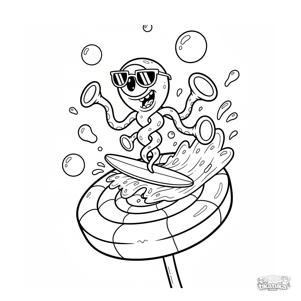 Página para colorear para niños de 7-9 años: un microbio espiral divertido surfeando sobre una ola pegajosa en un pirulito gigante. Escena de dibujos animados dinámica.