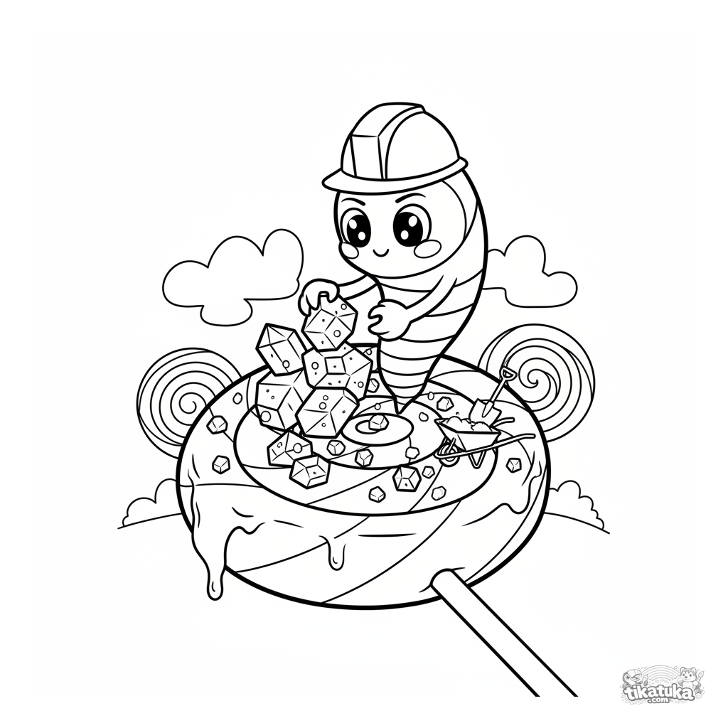 Página para colorear para niños 4-6: un microbio espiral con casco apila torres de cristales de azúcar en la superficie de una piruleta gigante.