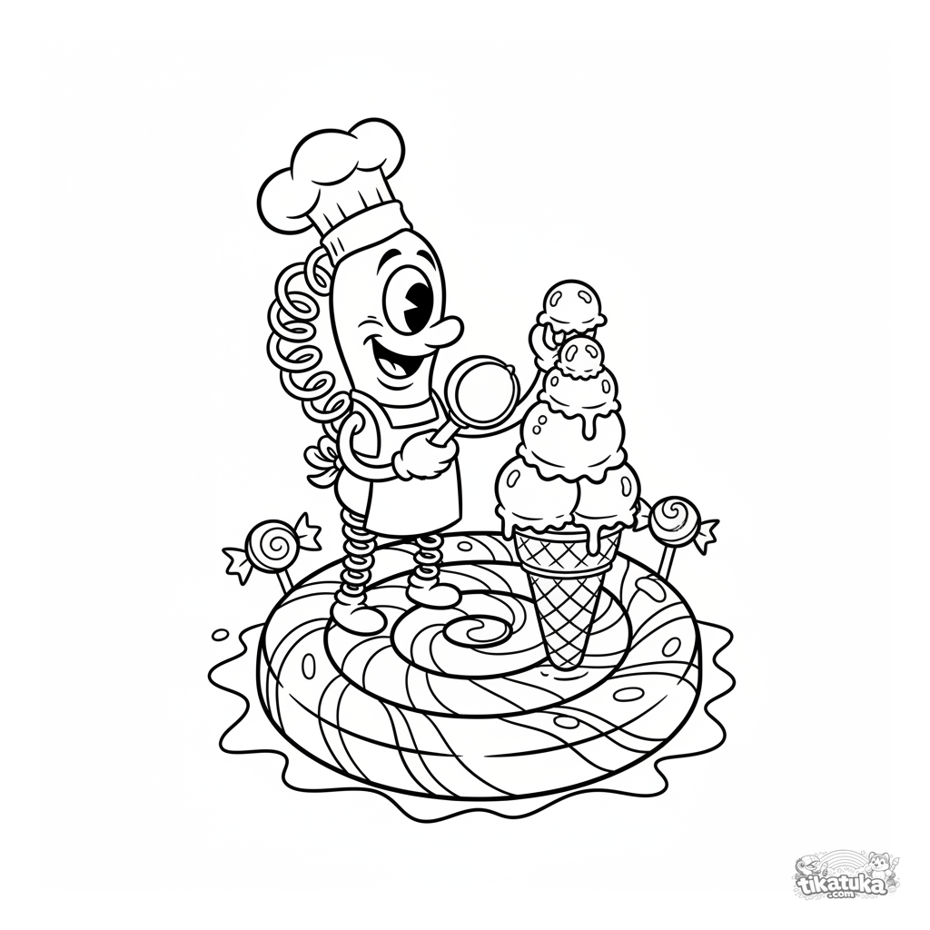 Página para colorear para niños 4-6: un microbio espiral divertido con gorro de chef haciendo helado en una piruleta gigante. Escena alegre.