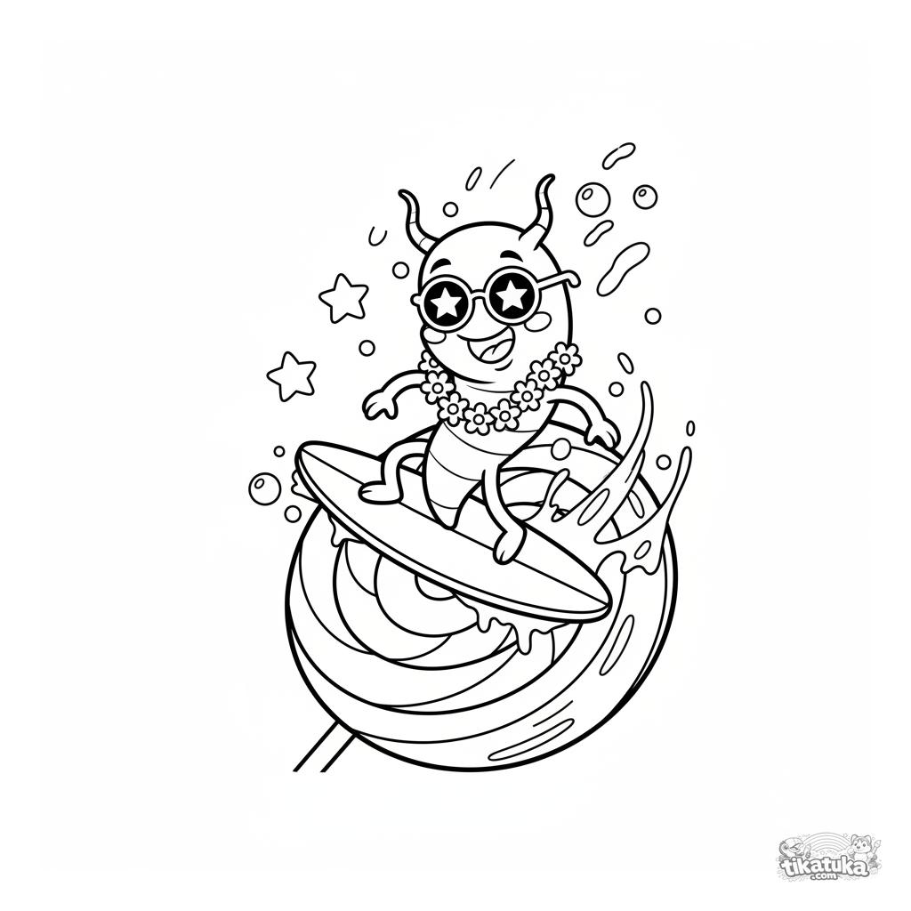 Página para colorear para niños de 7-9 años: un microbio espiral en estilo retro surfeando por una piruleta gigante. Escena dinámica y divertida.
