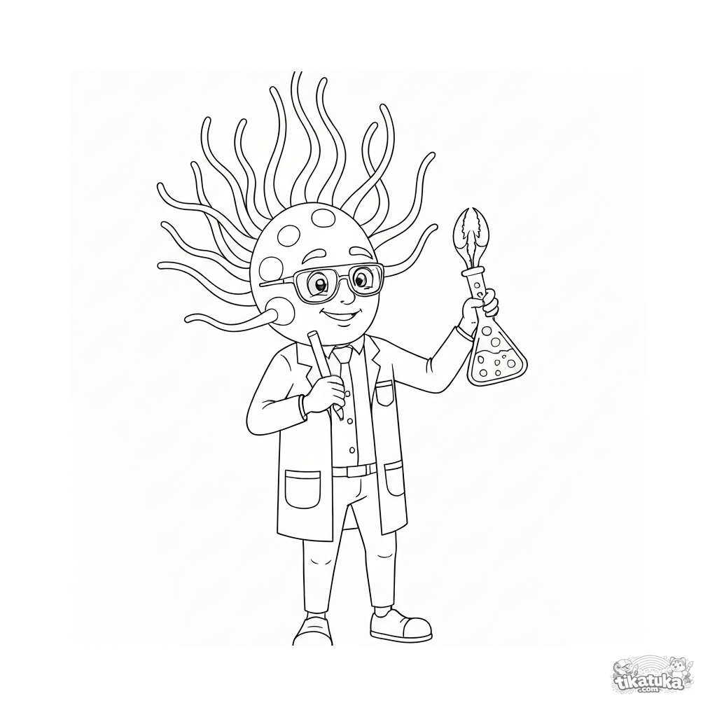 Página para colorear para niños. Microbio espiral científico con bata de laboratorio, matraz y flagelos. Microbiología educativa divertida. Descarga gratis.