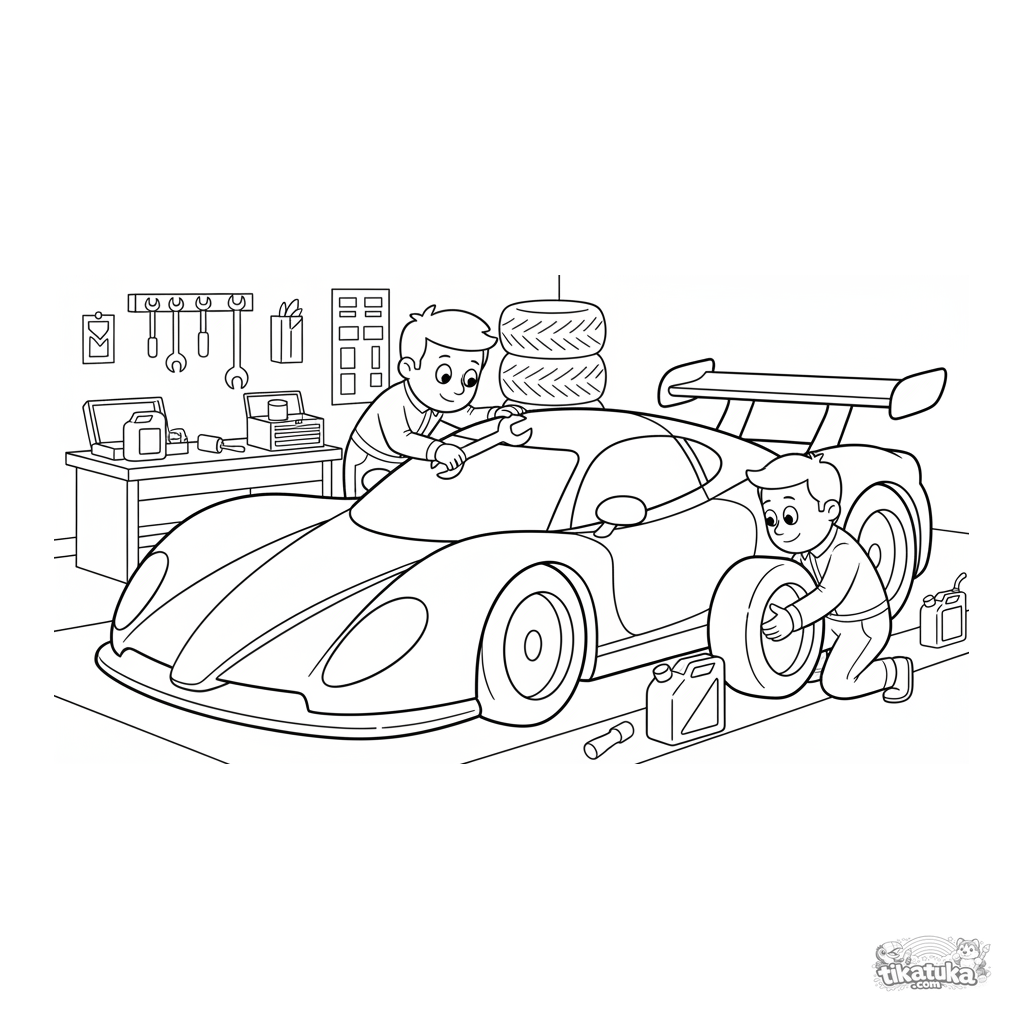 Página para colorear: un coche de carreras en el garaje, los mecánicos lo preparan. Muchos detalles: herramientas, neumáticos, capó abierto.