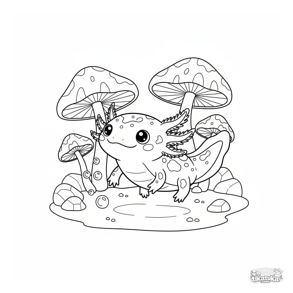 Página para colorear de un ajolote manchado en una gruta submarina entre hongos brillantes. Para niños de 4 a 6 años. Una criatura submarina linda y tranquila.