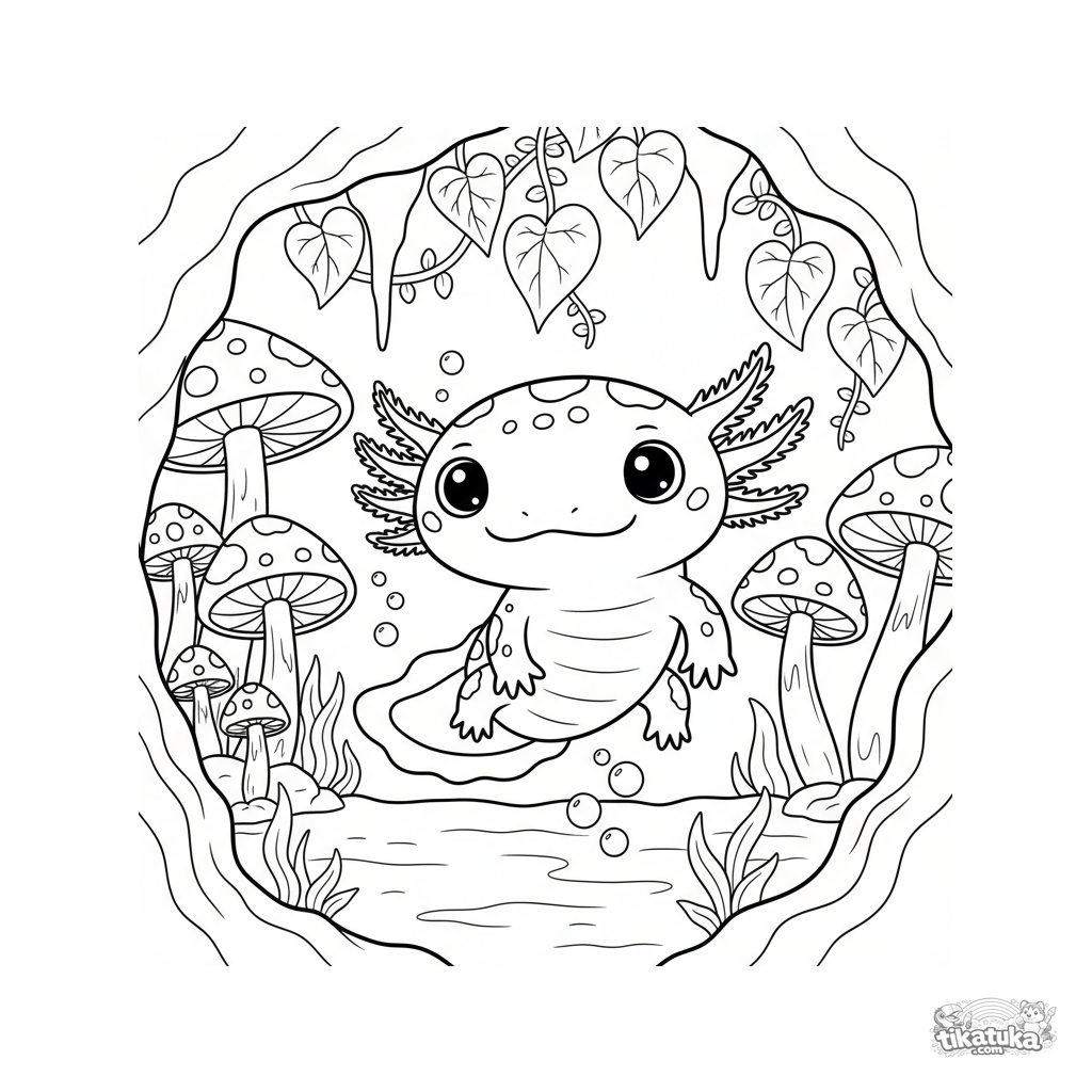 Página para colorear de un ajolote manchado nadando en una gruta submarina mágica entre hongos brillantes. Ideal para niños de 4 a 6 años.