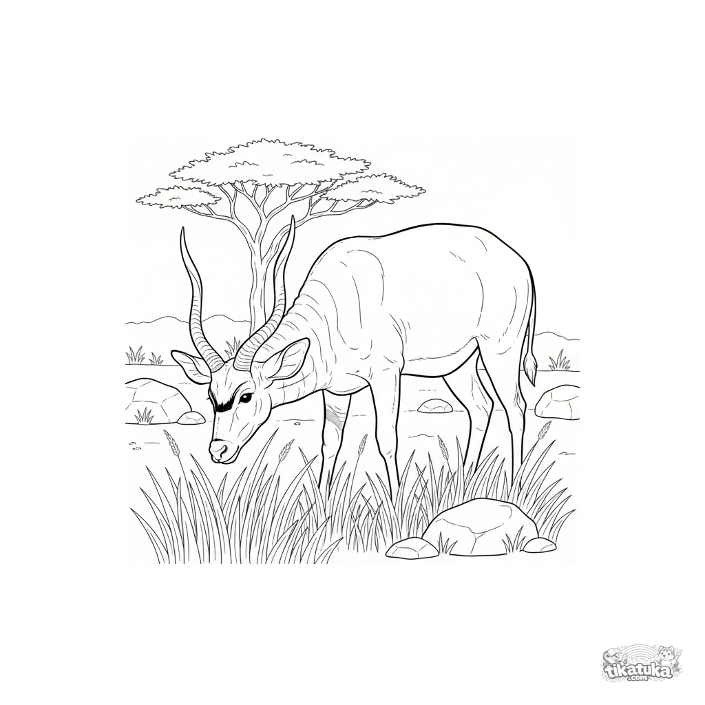 Página para colorear de un antílope bongo manchado para niños de 5-7 años. El antílope pasta pacíficamente en una sabana nebulosa. Formas simples, detalles claros.