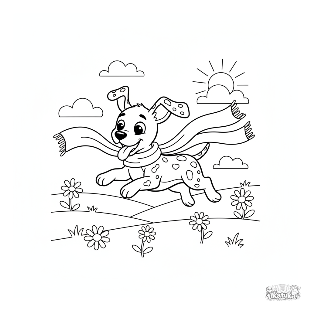 Página para colorear para niños de 4-6 años: un feliz cachorro dálmata manchado persigue una bufanda ondeante por un prado soleado. Formas simples y contornos claros.