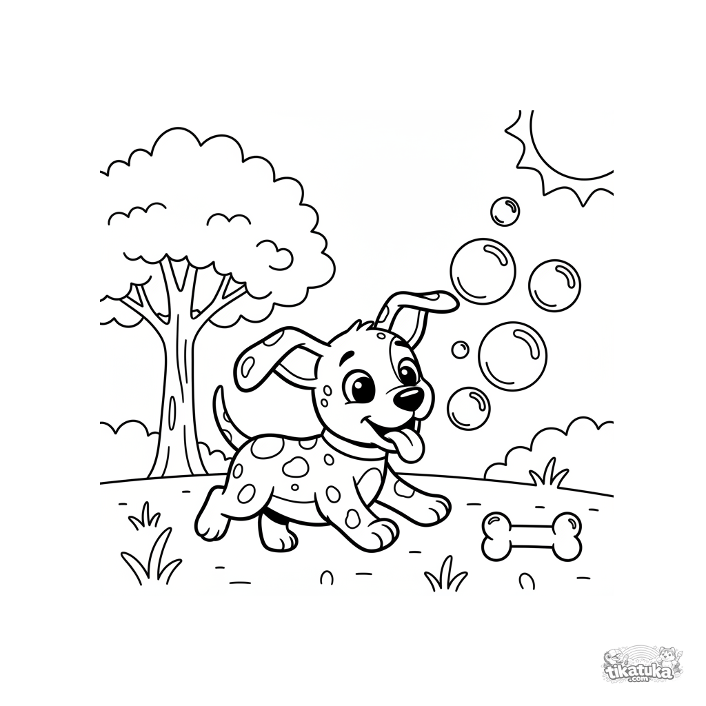 Página para colorear para niños pequeños: un alegre cachorro dálmata persigue burbujas de jabón al sol. Formas simples y grandes para 2-4 años.