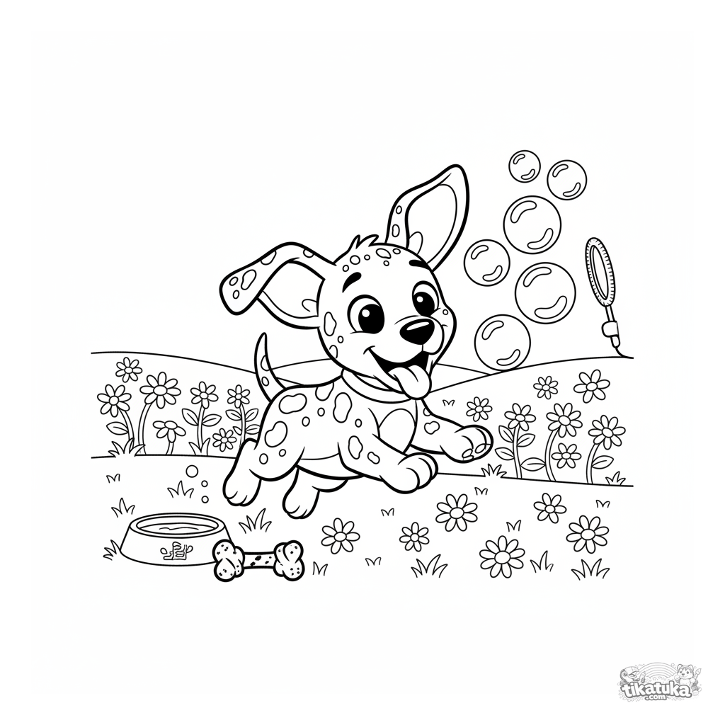 Página para colorear para niños 3-6: un juguetón cachorro dálmata persigue burbujas en un prado soleado. Detalles simples para colorear fácil.