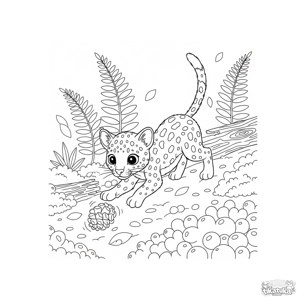 Página para colorear para niños de 4-6 años: un cachorro de jaguarundi persigue juguetonamente una piña rodante en un claro del bosque. Formas claras, escena atractiva.