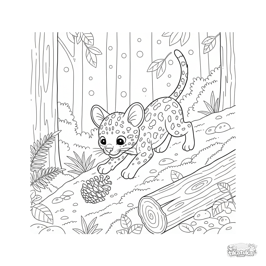 Página para colorear para niños de 4 a 6 años. Un pequeño cachorro de jaguarundi persigue juguetonamente una piña rodando por una pendiente musgosa.