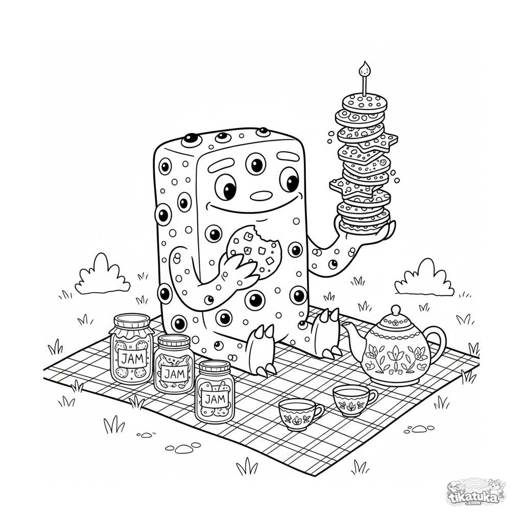 Página detallada para colorear para niños de 10-12 años: un monstruo cuadrado con muchos ojos construye una torre de galletas en un picnic. Estilo realista, muchos elementos: tarros, tetera, manta.