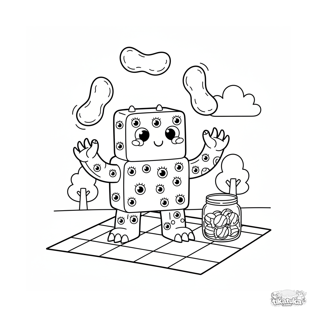 Página para colorear para niños de 4-6 años: un monstruo cuadrado con muchos ojos hace malabares con golosinas gigantes en un picnic. Escena divertida y simple.