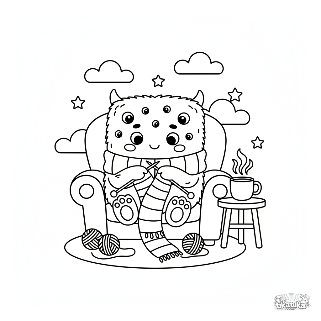 Página para colorear para niños: un monstruo cuadrado y peludo con muchos ojos tejiendo una bufanda larga en un sillón acogedor. Escena tranquila.