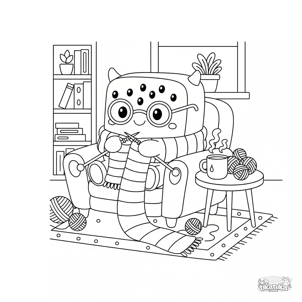 Página para colorear para niños: un monstruo cuadrado con muchos ojos tejiendo una bufanda en un sillón acogedor.