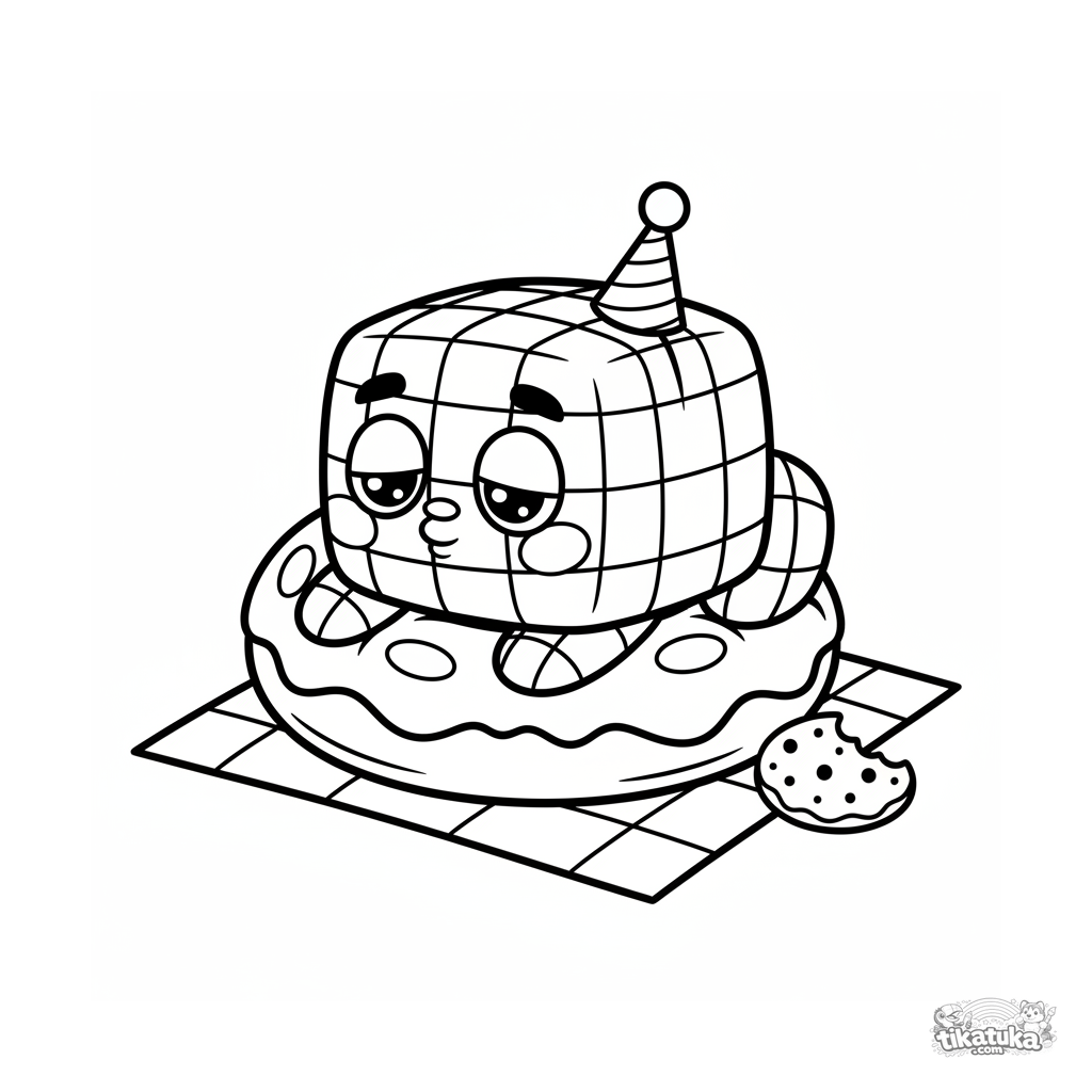 Página simple para colorear para bebés: un monstruo cuadrado durmiendo en un donut en un picnic. Formas grandes, pocos detalles. Para 2-3 años.