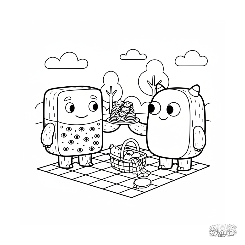 Página para colorear para niños 4-6 años: un monstruo cuadrado con muchos ojos ofrece educadamente un plato de galletas en un picnic monstruoso. Escena sobre amabilidad y golosinas.
