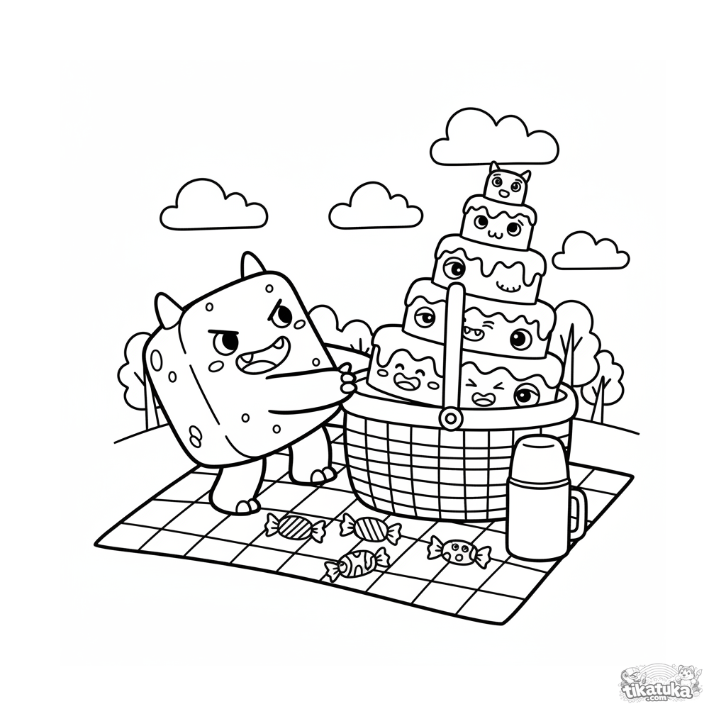 Página para colorear para niños de 4-6 años: un monstruo cuadrado con muchos ojos desempacando una cesta de picnic con un pastel.