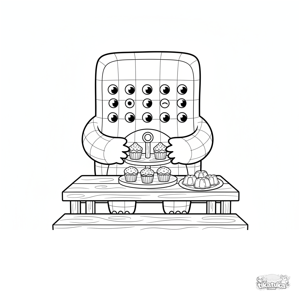 Página para colorear de un monstruo cuadrado con muchos ojos organizando magdalenas en un picnic. Detalle intrincado para niños mayores de 10-12 años.