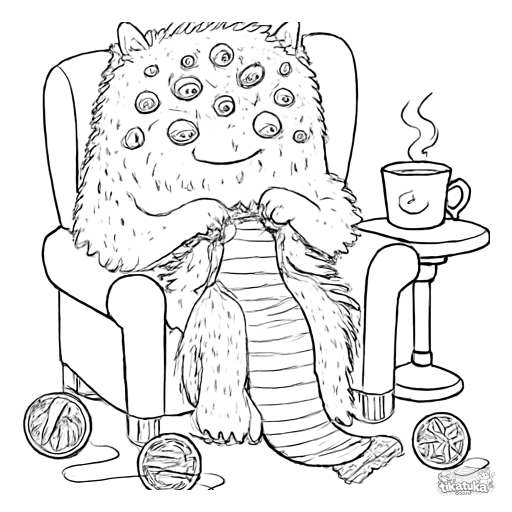 Página para colorear detallada de un monstruo cuadrado con muchos ojos tejiendo una bufanda en un sillón. Para niños de 6 a 9 años.