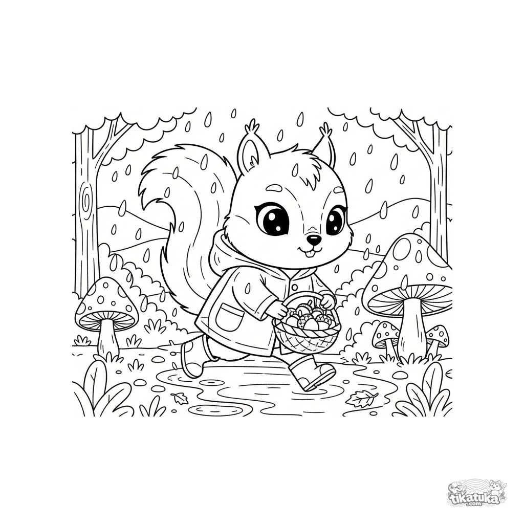 Página para colorear para niños de 4-6 años: una ardilla con impermeable y botas recolecta bellotas en un sendero boscoso bajo la lluvia otoñal. Detalle moderado.
