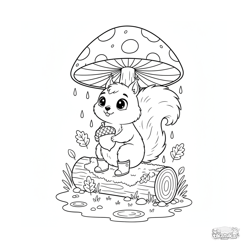 Página para colorear para niños 4-6: una ardilla esponjosa con botas se refugia de la lluvia bajo un hongo grande, sosteniendo una bellota. Escena de bosque otoñal con charcos y hojas.