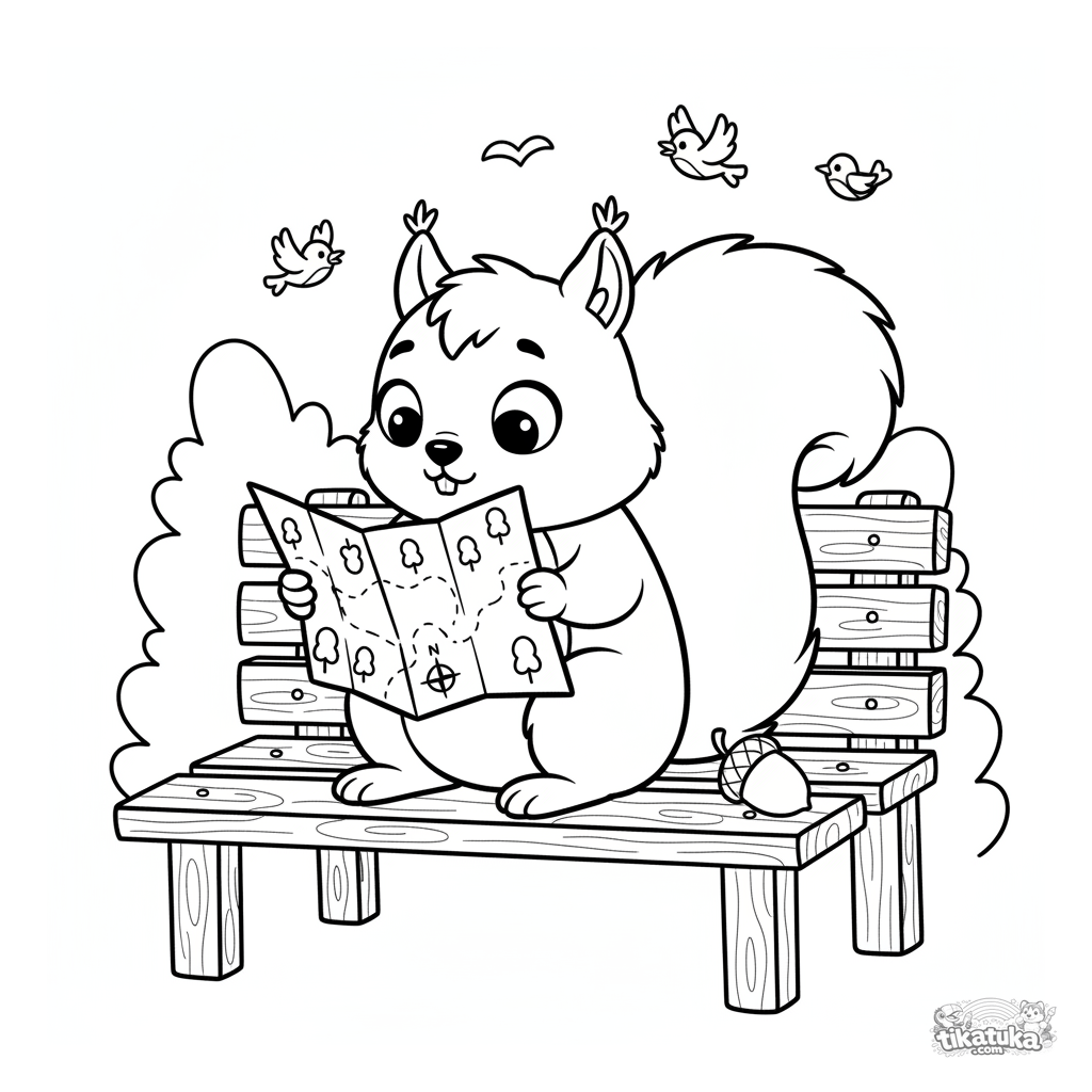 Página para colorear para niños 4-6: una ardilla sentada en un banco del parque estudiando un mapa. Escena tierna.