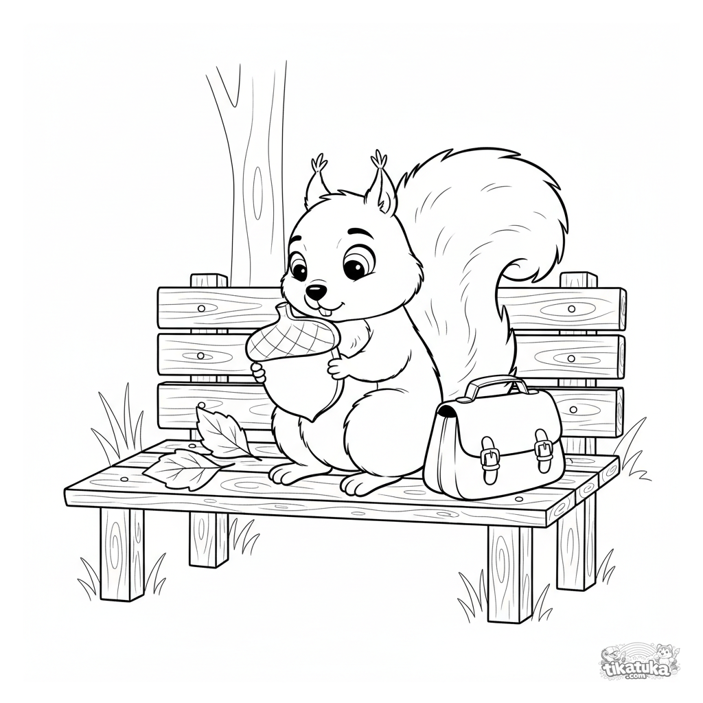 Página para colorear para niños de 7-9 años: una ardilla sentada en un banco del parque urbano, resolviendo un rompecabezas de bellota. Hojas de otoño alrededor.