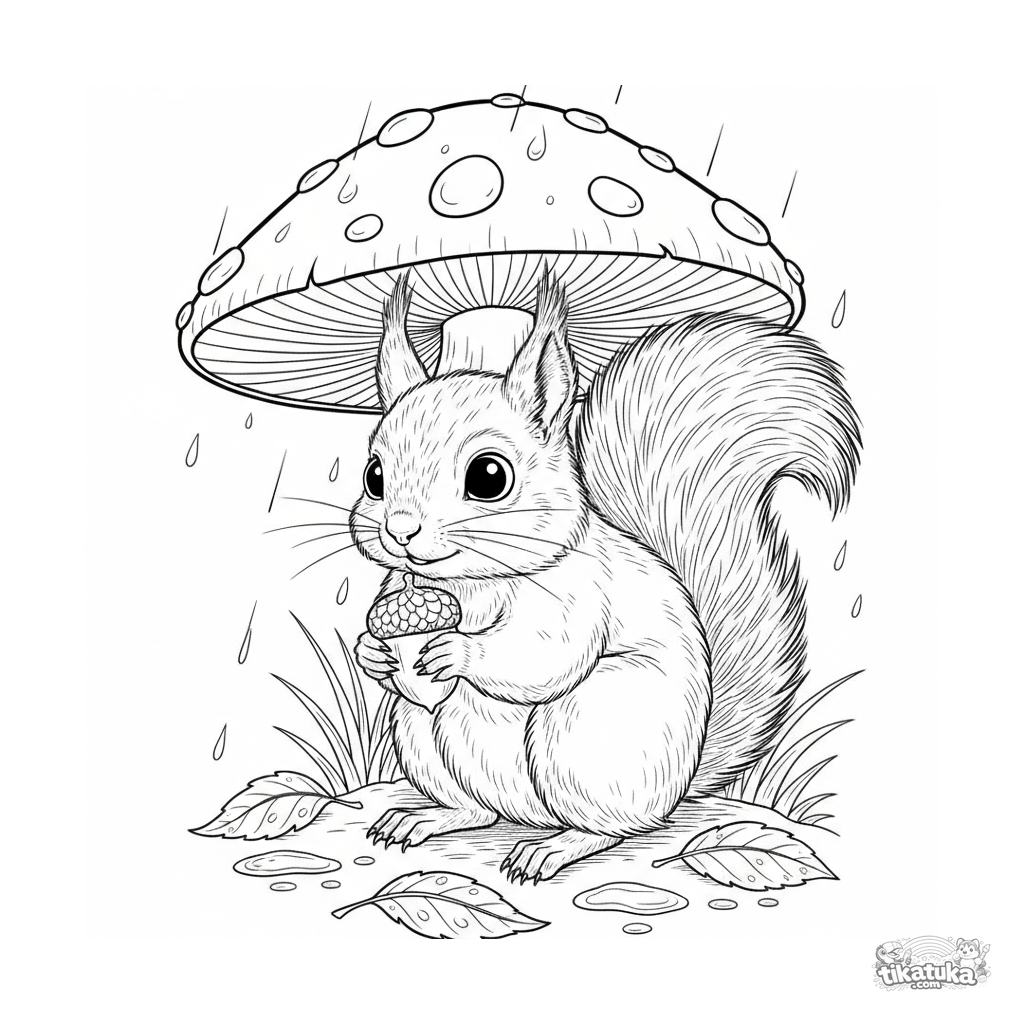 Página detallada para colorear para 10-12 años: una ardilla joven con una bellota se refugia de la lluvia bajo una gran seta moteada en el suelo del bosque otoñal.