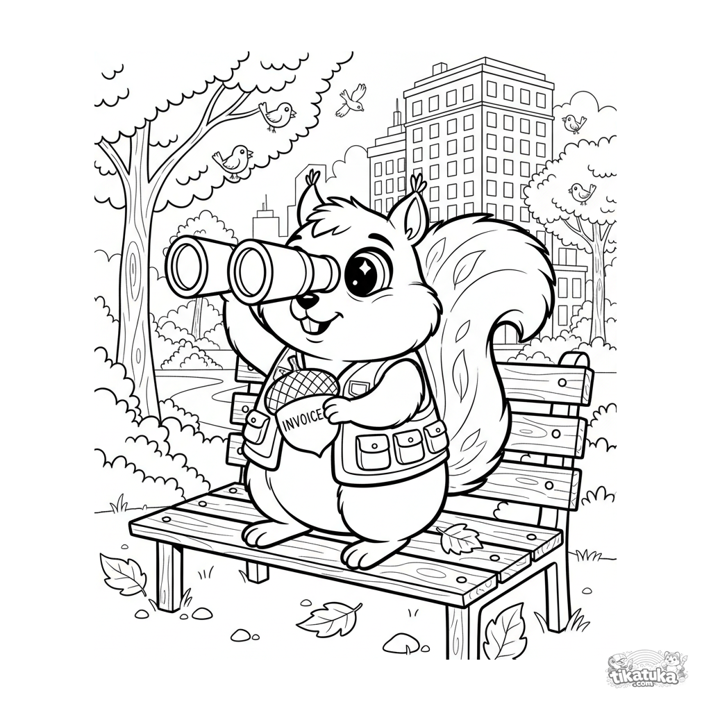 Página para colorear para niños de 10-12 años: una ardilla decidida con chaleco y prismáticos en un banco del parque, buscando su día de pago. Escena graciosa y detallada.