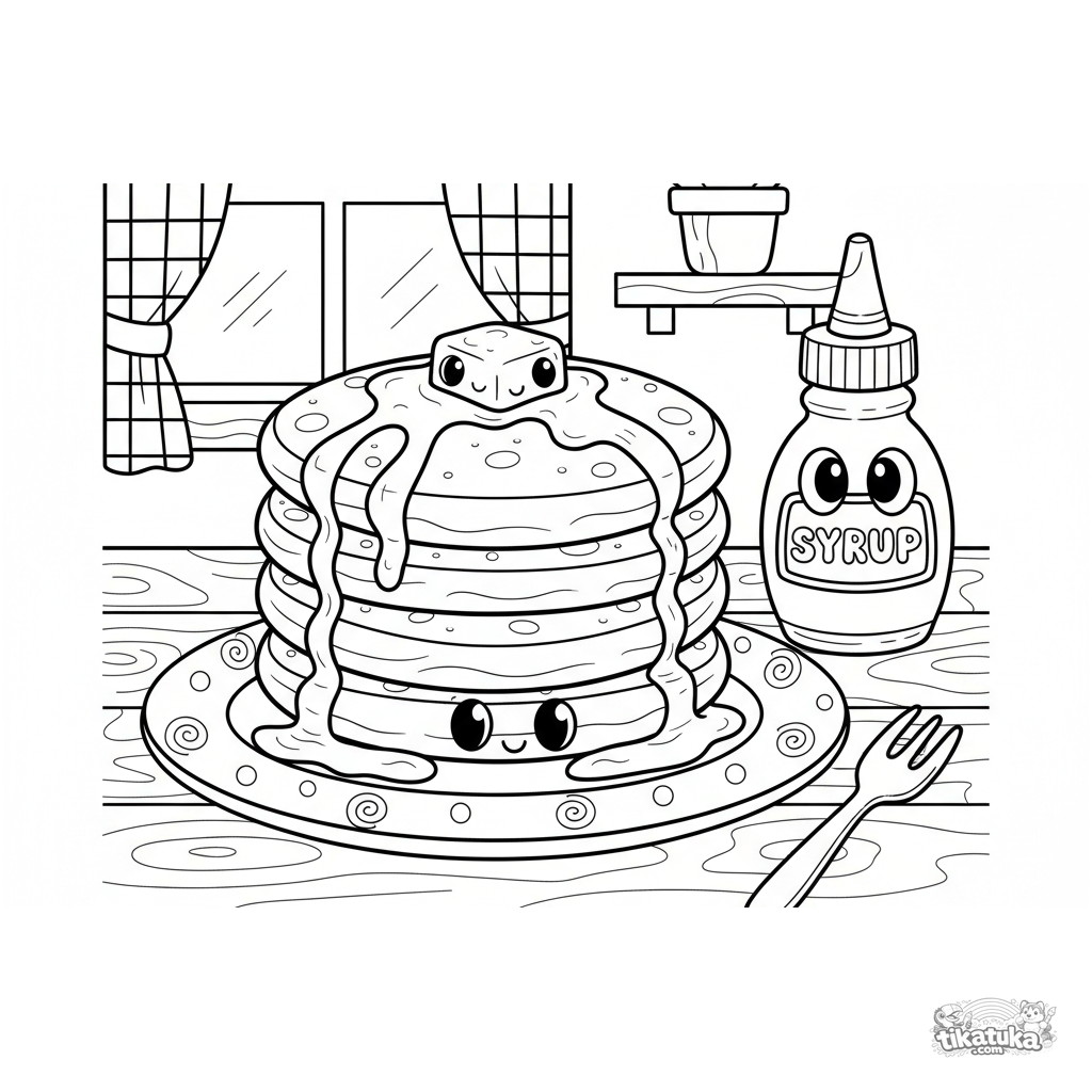Página para colorear de comida para niños de 4 a 6 años. Una torre de panqueques esponjosos con jarabe y mantequilla derritiéndose sobre la mesa.