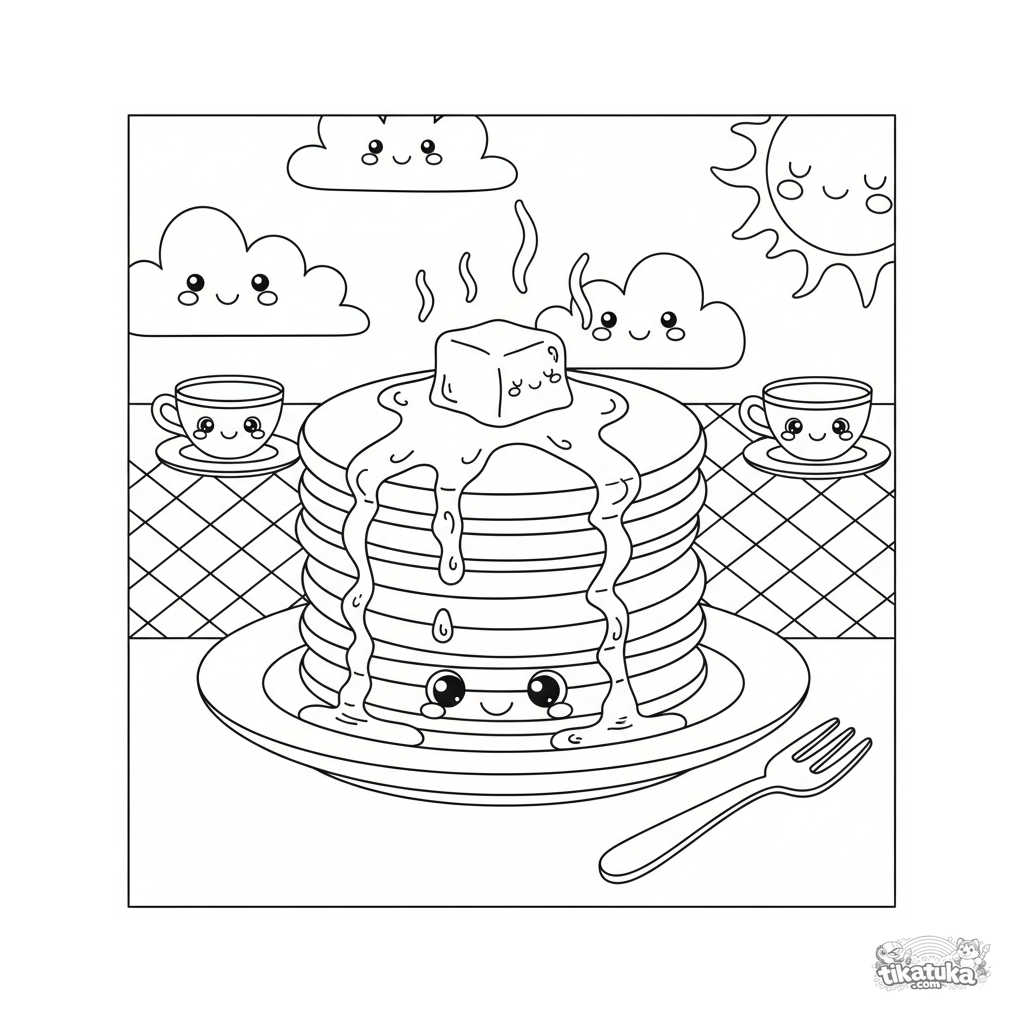 Página para colorear una torre de panqueques deliciosos para niños de 4 a 6 años. Muestra panqueques esponjosos con mantequilla y jarabe en un plato, un tenedor al lado.