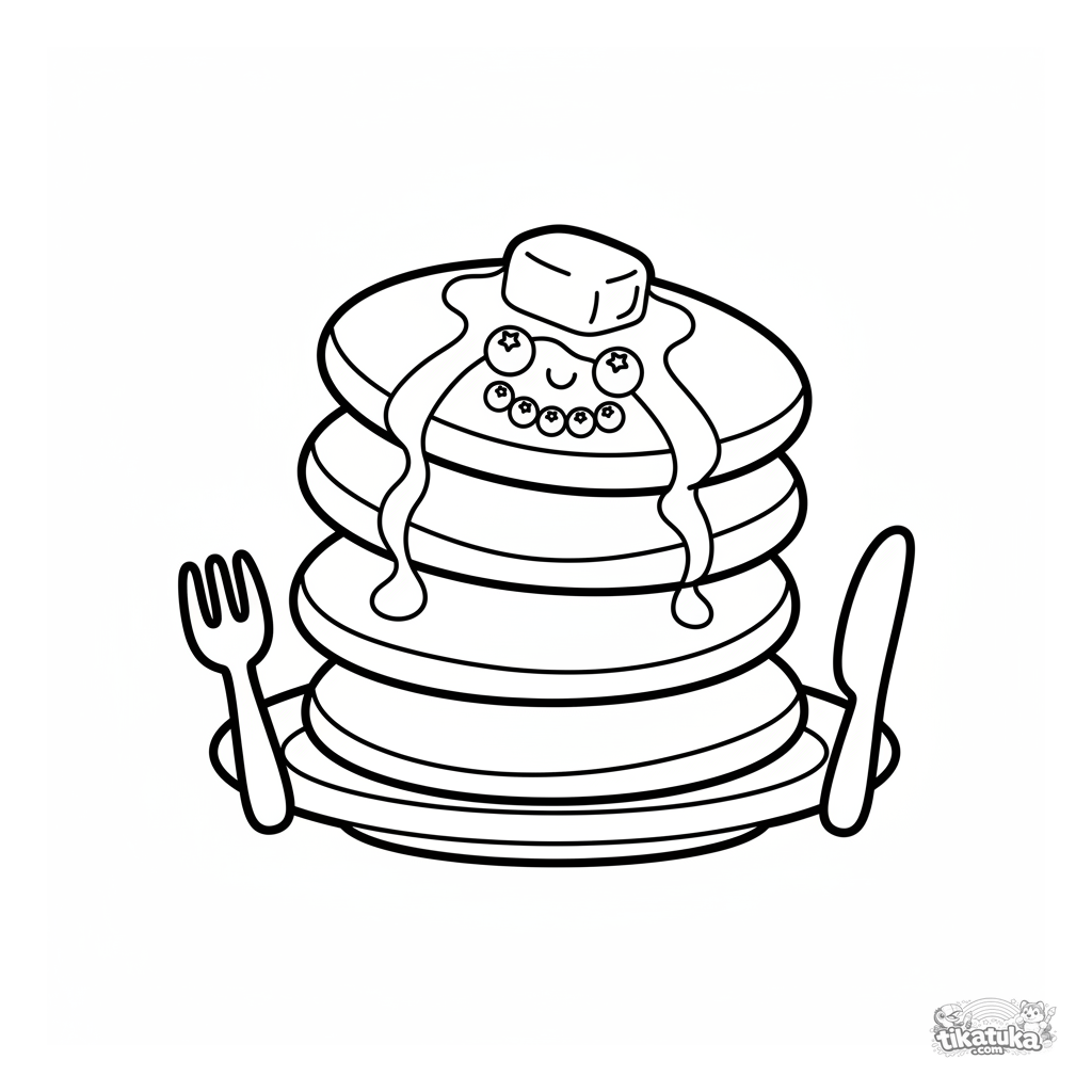 Página divertida para colorear para niños pequeños: una torre de panqueques con cara sonriente. Formas grandes y simples para niños de 2-3 años.