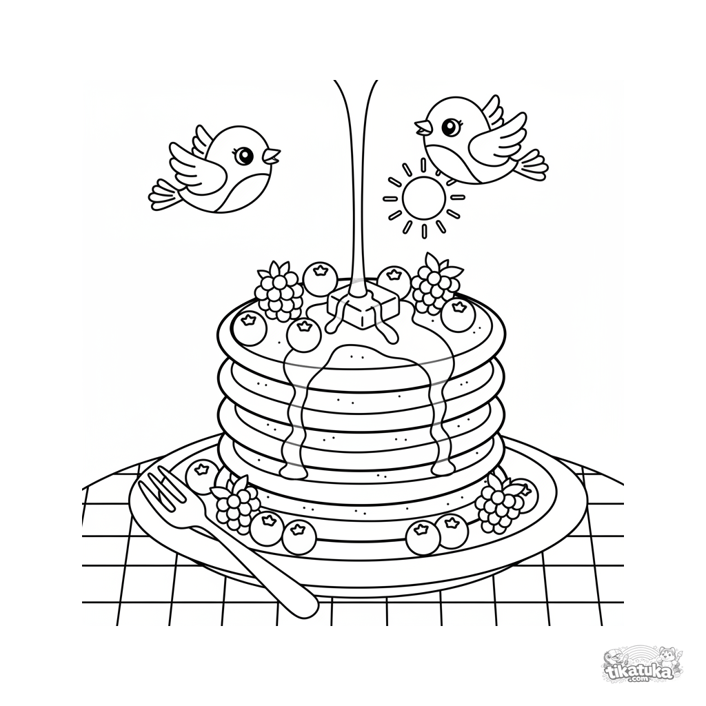 Página para colorear de una apetitosa torre de panqueques con bayas y jarabe. Para niños de 4 a 6 años. Una escena de comida simple y divertida.