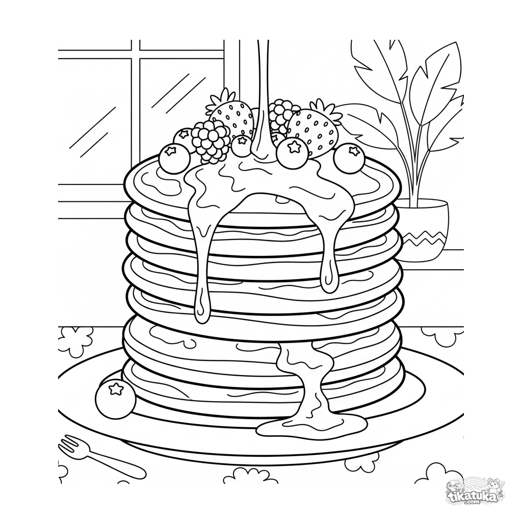 Página para colorear de una torre de panqueques con bayas y sirope. Para niños de 4 a 6 años. Escena divertida y simple.