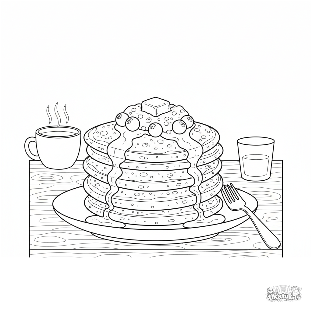 Página para colorear simple para niños pequeños 2-3: una gran torre de panqueques con bayas. Formas grandes y claras, poco detalle, ideal para primeros coloreos.