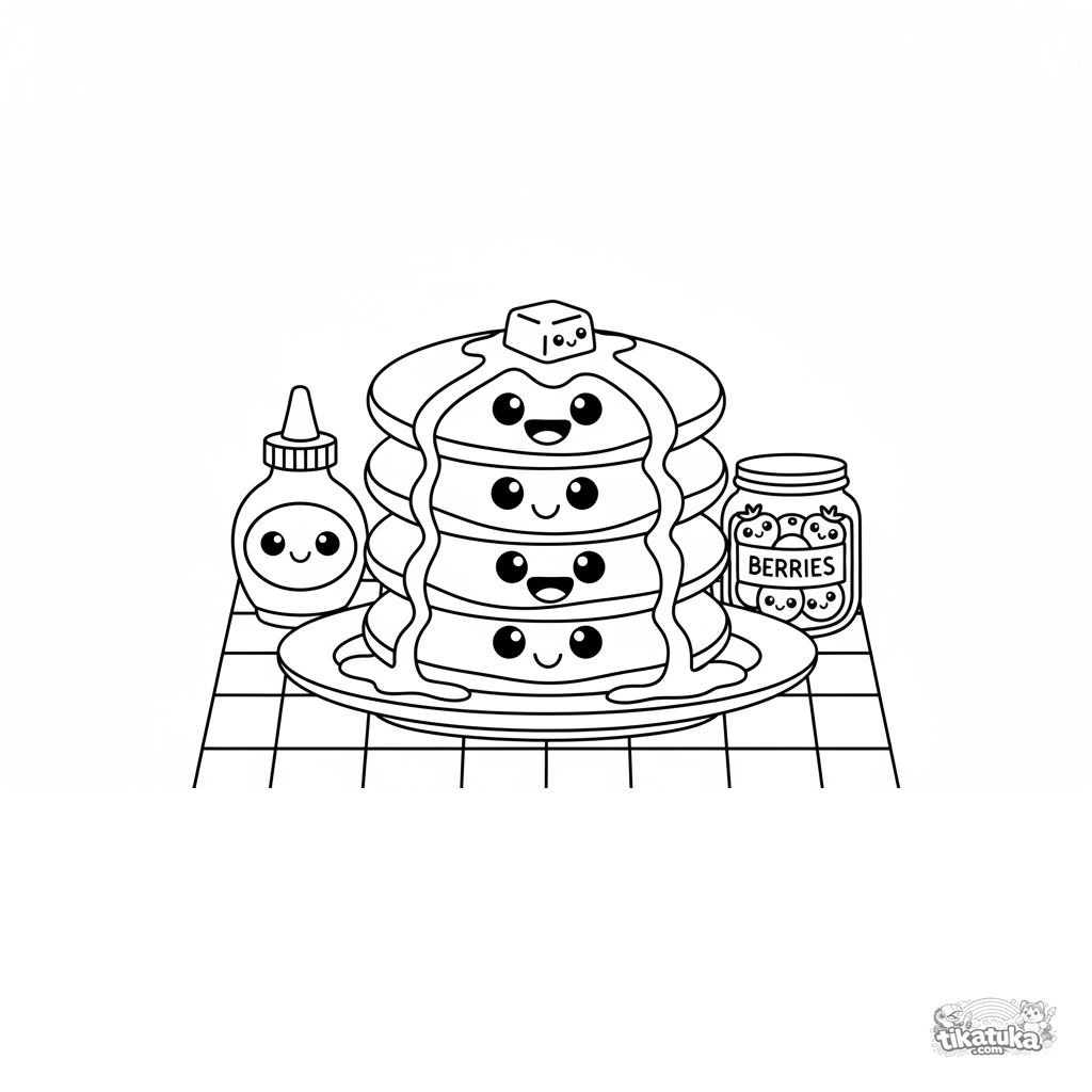 Página para colorear simple para niños pequeños: una torre de panqueques con jarabe y mantequilla. Para edades 2-3. Formas grandes y simples con caras felices en la comida.