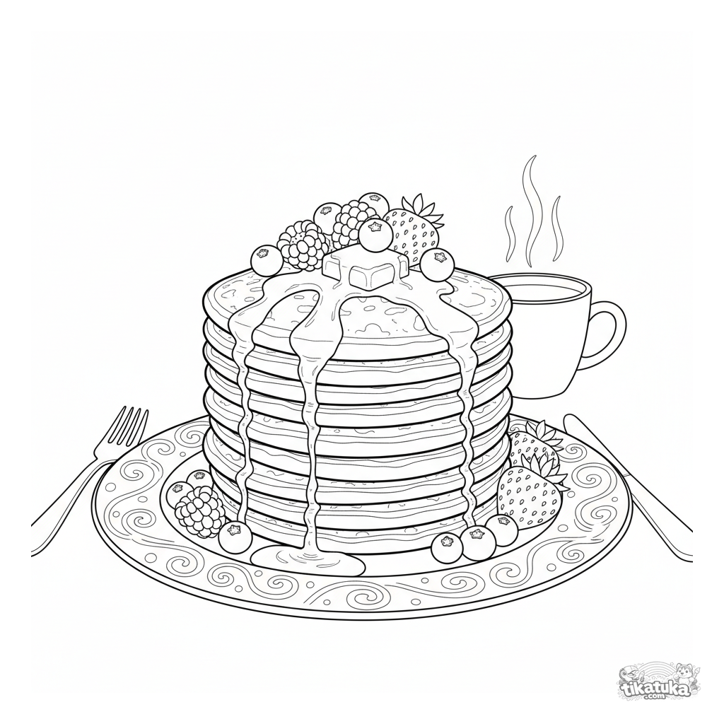 Página para colorear de comida deliciosa para niños de 4 a 6 años. Una torre de panqueques con jarabe, bayas y mantequilla.