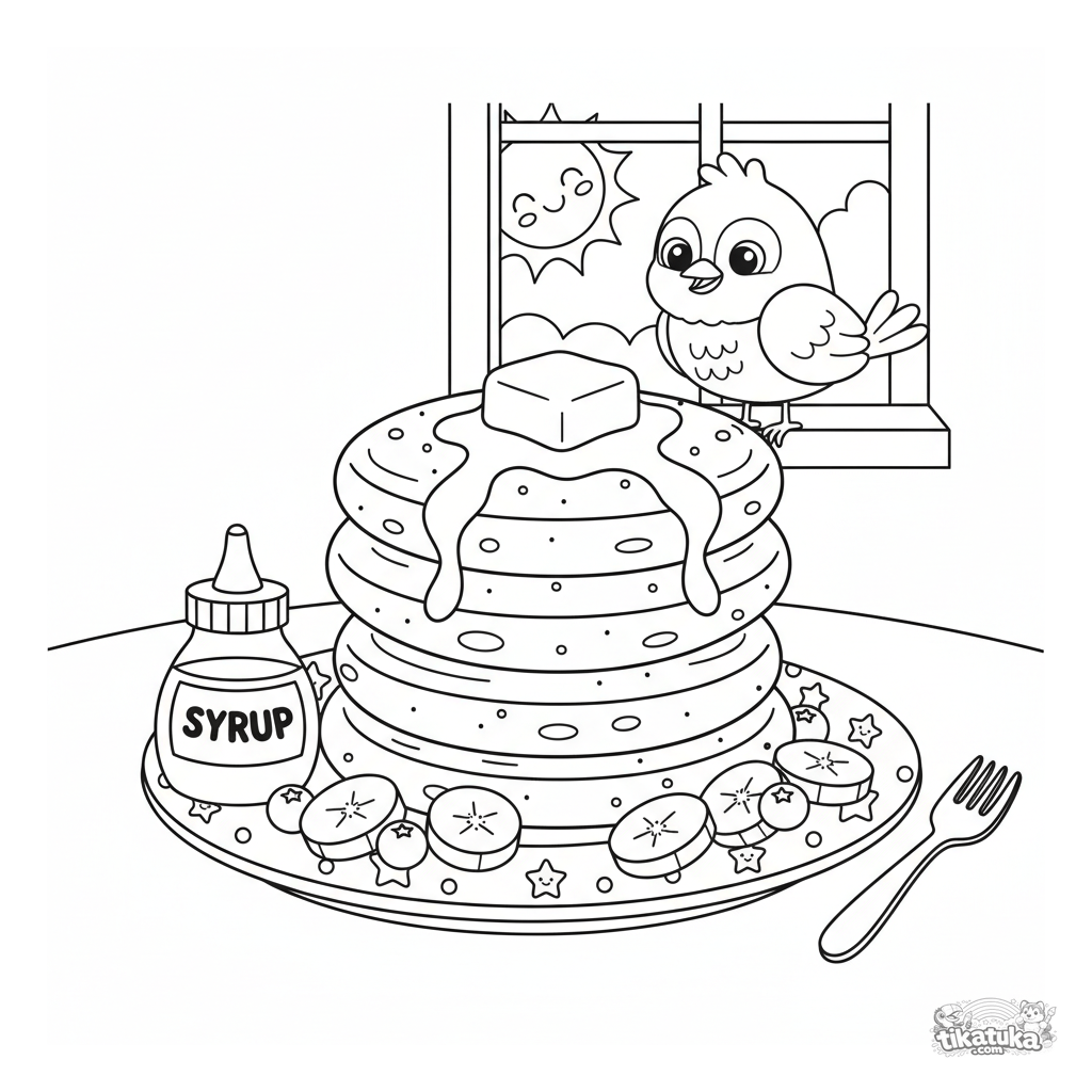 Página para colorear de comida para niños de 4 a 6 años. Muestra una torre de panqueques esponjosos con mantequilla derritiéndose y frutas en un plato.