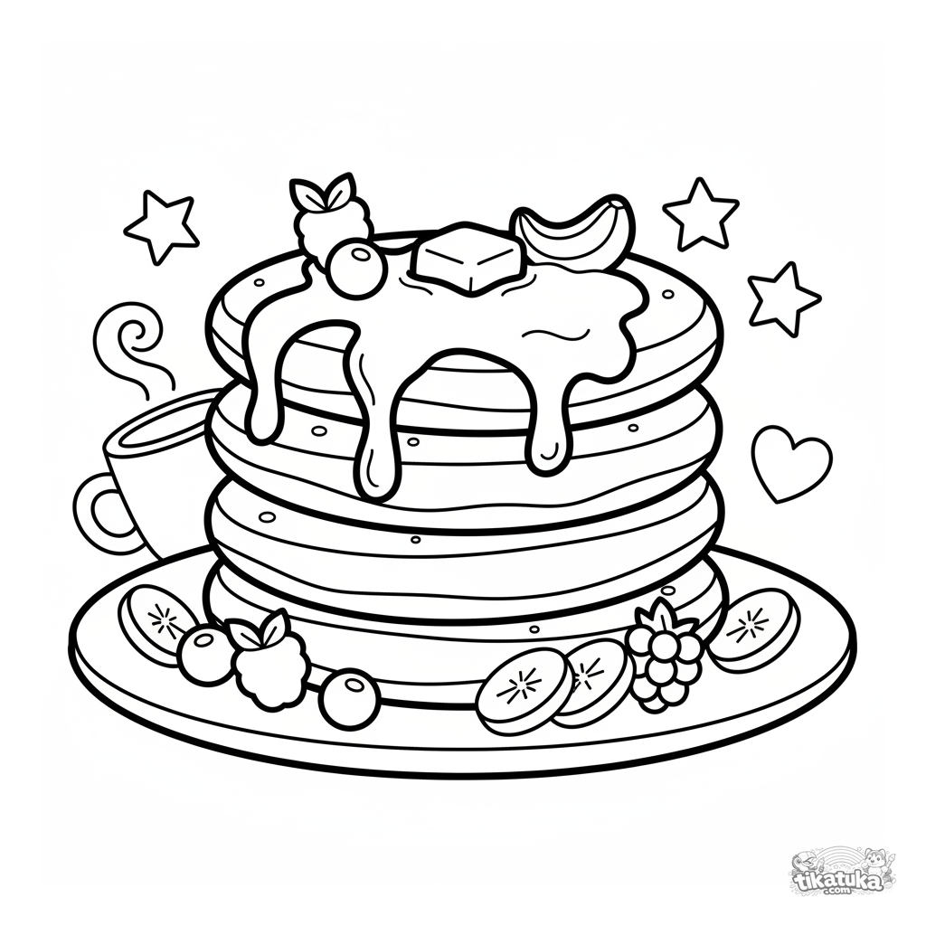 Página para colorear para niños de 4 a 6 años: una torre de panqueques con bayas y cobertura. Escena brillante y simple, ideal para aprender sobre comida.